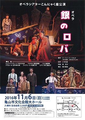 オペラシアターこんにゃく座公演 『オペラ 銀のロバ』 原作:ソーニャ・ハートネット(野沢佳織訳 主婦の友社刊による) 台本:いずみ凜 作曲:萩 京子 演出:恵川智美 出演: 井村タカオ、豊島理恵、飯野薫、金村慎太郎、佐藤久司、井口真由子 主催: (公財)亀山市地域社会振興会(亀山市文化会館)、亀山こども劇場 会場:大ホール 13:30開場 14:00開演 入場料:≪全自由席≫2,500円 ※4歳未満膝上鑑賞無料(親子室有り) 問い合わせ:亀山市文化会館(0595-82-7111)、亀山こども劇場(0595-83-3534) |
