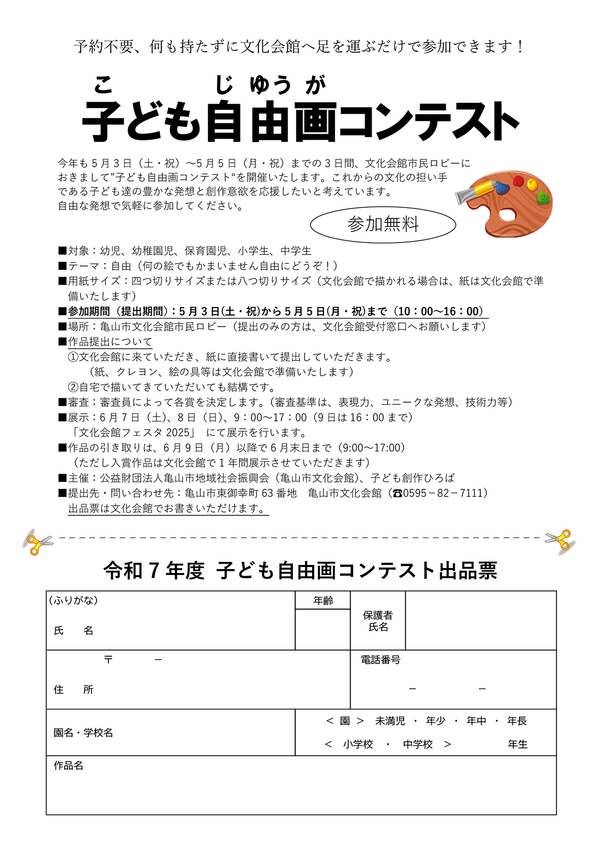 『5月大型連休ふれあいプラン』 『子ども自由画コンテスト』 参加無料 何も持たずに文化会館へ足を運んで絵を描こう! ◆ 要予約イベント 「葉(は)っぱをよく見(み)て描(えが)こう」 参加費300円(税込)/1名 定員10名 「器に絵付けをしよう」 【1回目】10:00〜11:30※定員に達しました。 【2回目】13:30〜15:00※定員に達しました。 参加費500円(税込)/1セット(丸皿・角皿各1個) 定員10名 <<石水渓キャンプ場特別企画>> 「そば打ち体験教室」 【1回目】9:30※定員に達しました。 【2回目】13:30※定員に達しました。 参加費3,500円/1組 定員各回5組程度(1組2名〜3名) 予約状況は下記までお問い合わせください。 ◆ 主催:公益財団法人亀山市地域社会振興会(亀山市文化会館) TEL:0595-82-7111 |